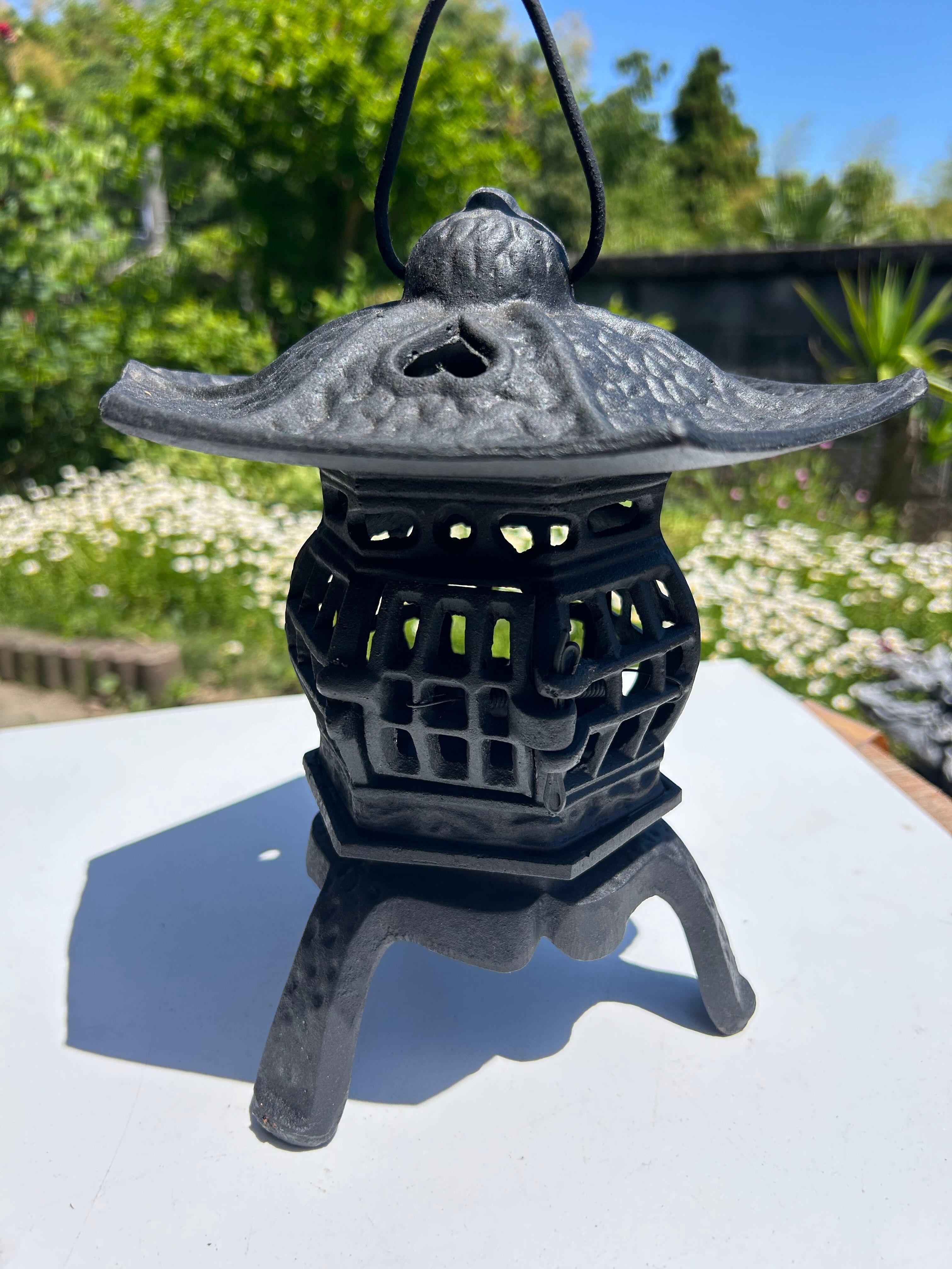 しっかりとした鉄製の釣り灯籠です。中にキャンドルやLEDライトなどを置く台があります